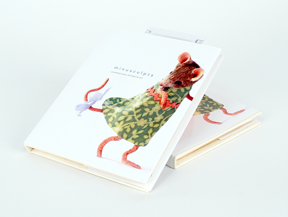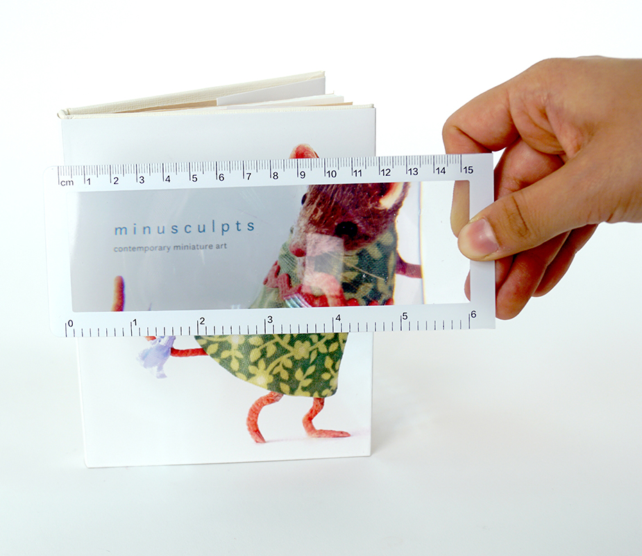 An exhibition catalog for a hypothetical exhibit centered around miniatures and small-scale sculpting. Each book includes a magnifying glass with a ruler, with the idea that it could be used in the exhibit for a better sense of scale and a closer look at the artwork.